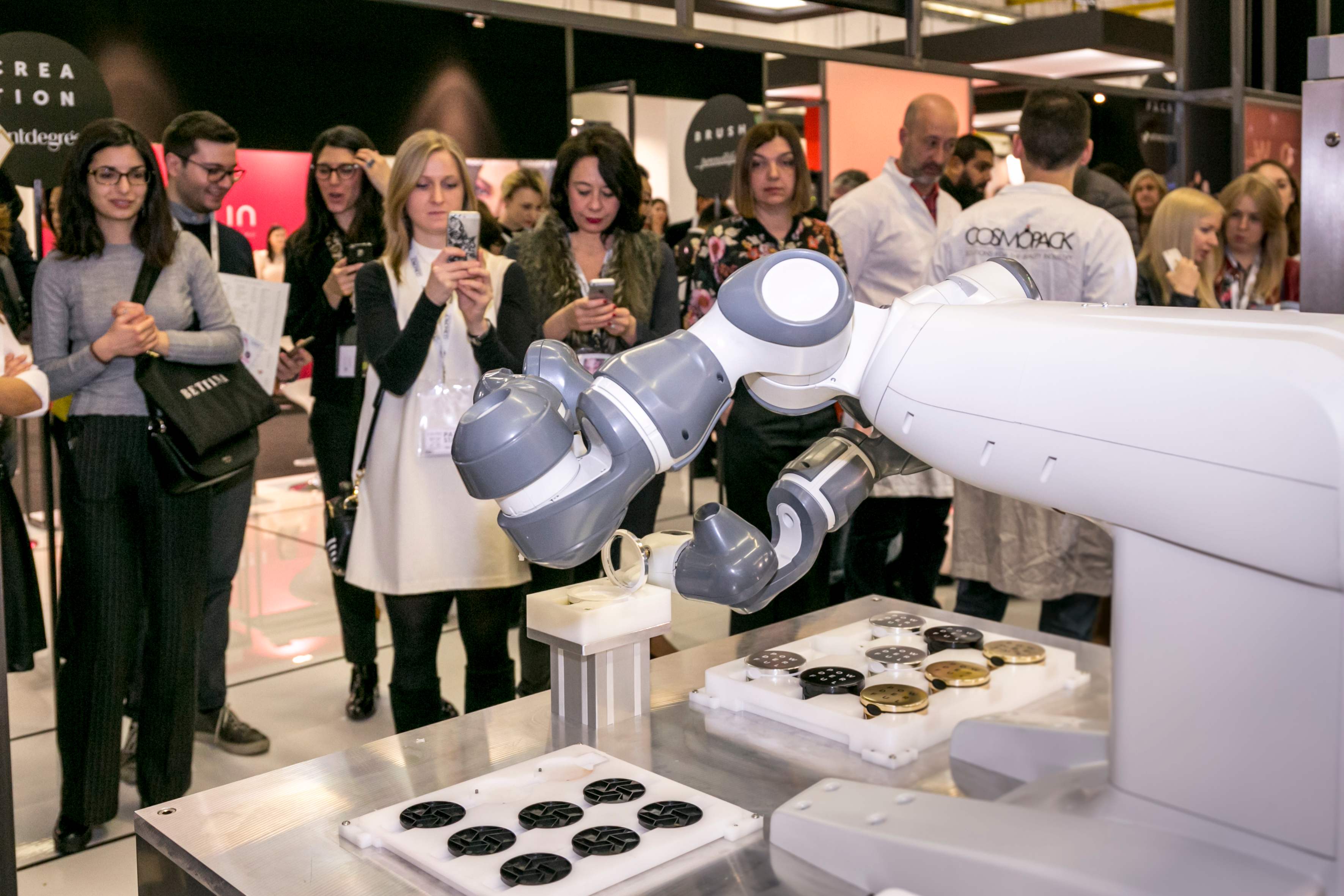 La seconda fase, davvero emozionante, è il clou dell’experience: la produzione. In diretta abbiamo assistito alla colatura dei pigmenti, successivamente pressati a caldo. L’elemento che da sempre distingue la Cosmopack Factory è proprio questo step: la realizzazione dal vivo del cosmetico. Quest’anno a rappresentare l’innovazione, le tecnologie e la ricerca alla base del processo di produzione, una selezione di espositori: Ancorotti Cosmetics, Ars Metallo, HCP, Nastritex, Pennelli Faro e Vetraco Group.